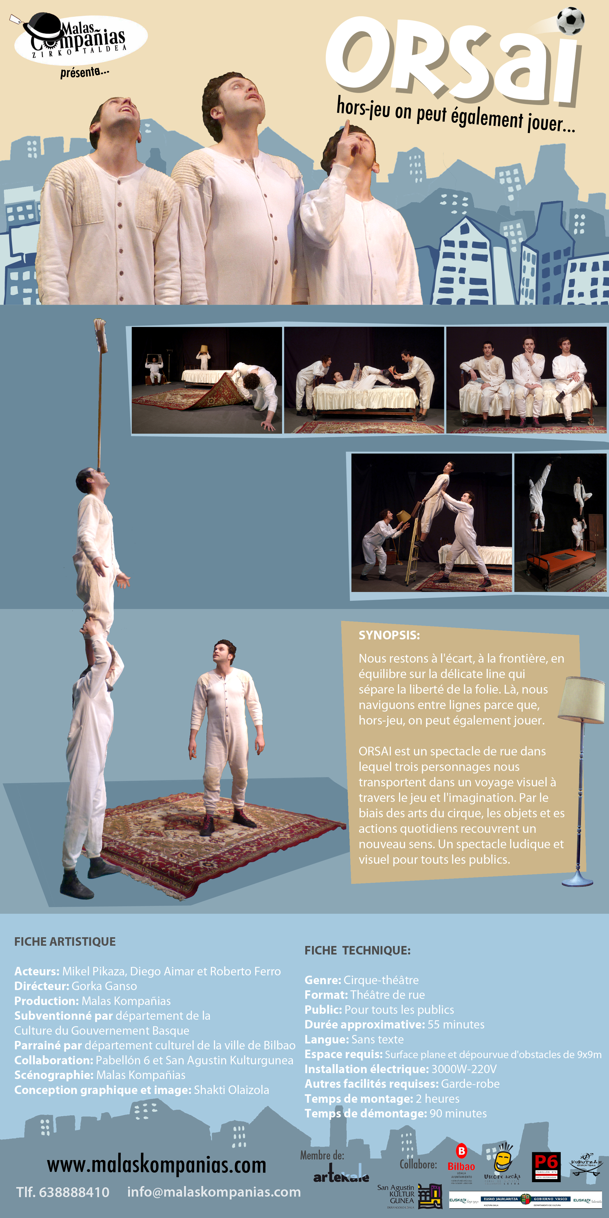 ORSAI es un espectaculo de calle en el que tres personajes nos trasladan en un viaje visual a traves del juego y la imaginacion. Mediante tecnicas circenses los objetos y acciones mas cotidianas tomaran un nuevo sentido. Un espectaculo ludico y visual para todos los publicos.
